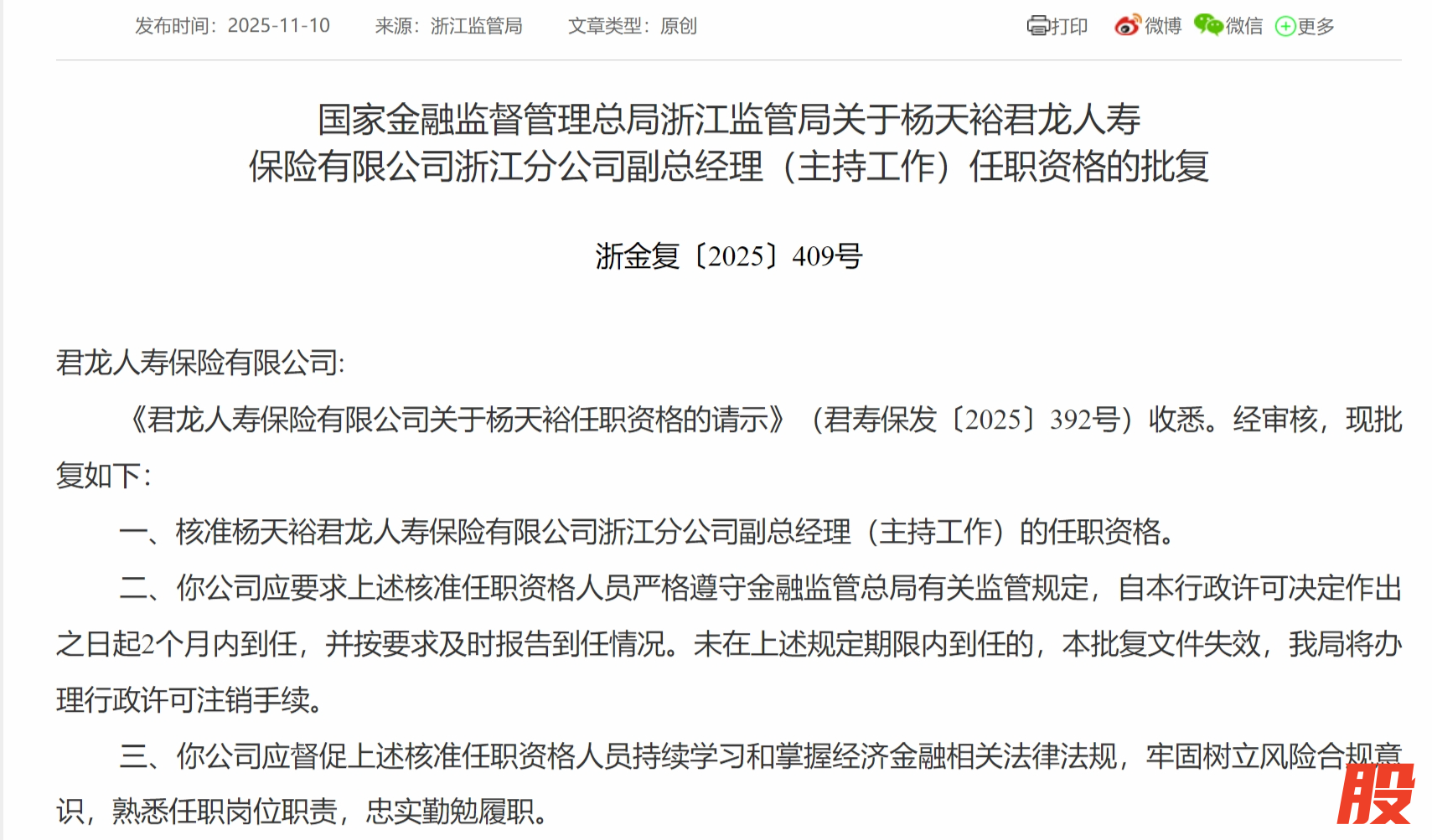 11月10日,国家金融监督管理总局浙江监管局发布关于杨天裕君龙人寿保险有限公司浙江分公司副总经理(主持工作)任职资格的批复,核准杨天裕君龙人寿保险有限公司浙江分公司副总经理(主持工作)的任职资格。